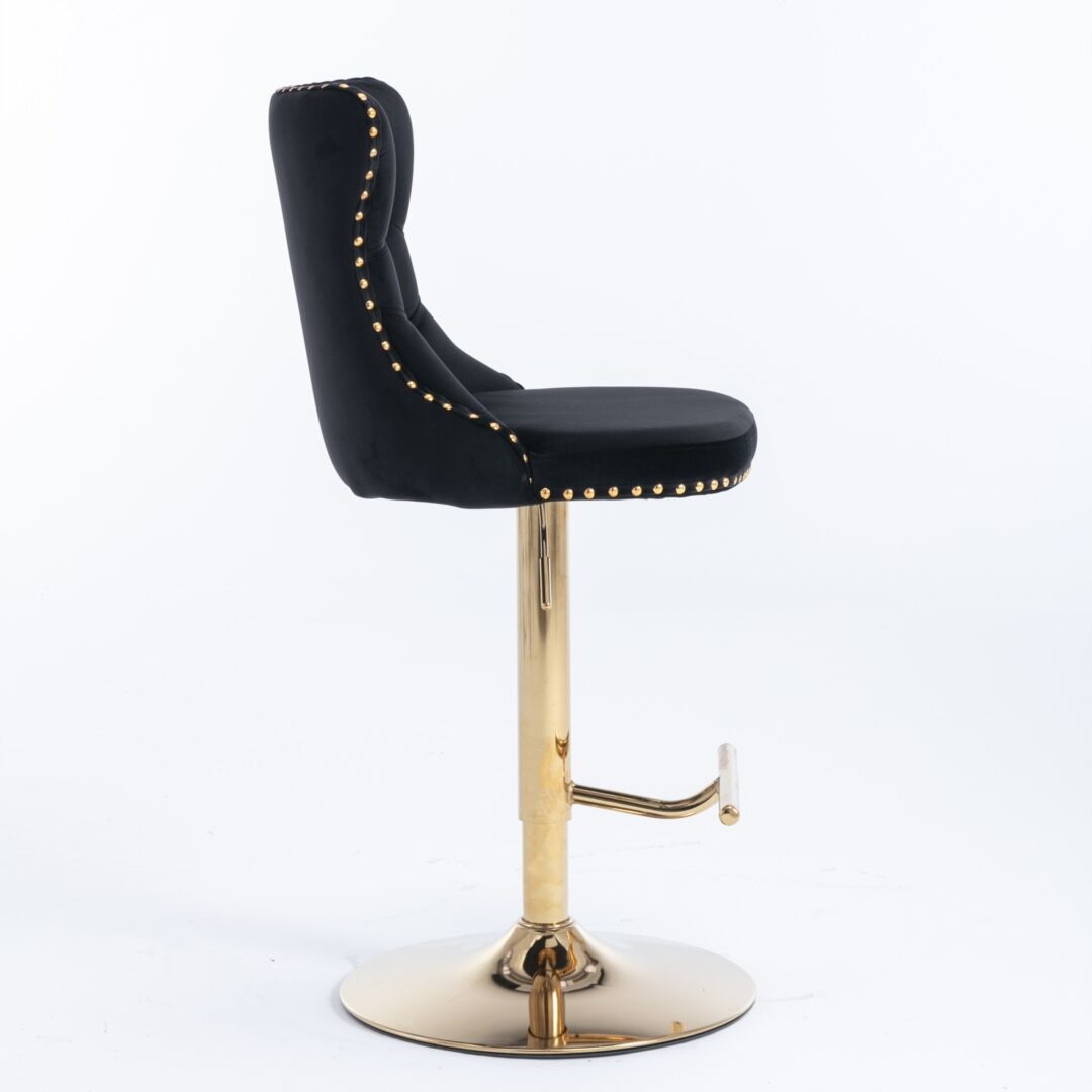 This bar stool features a sturdy golden chromed metal base with a built in 360 swivel function and footrest. A plastic ring is attached to prevent floor from scratching.