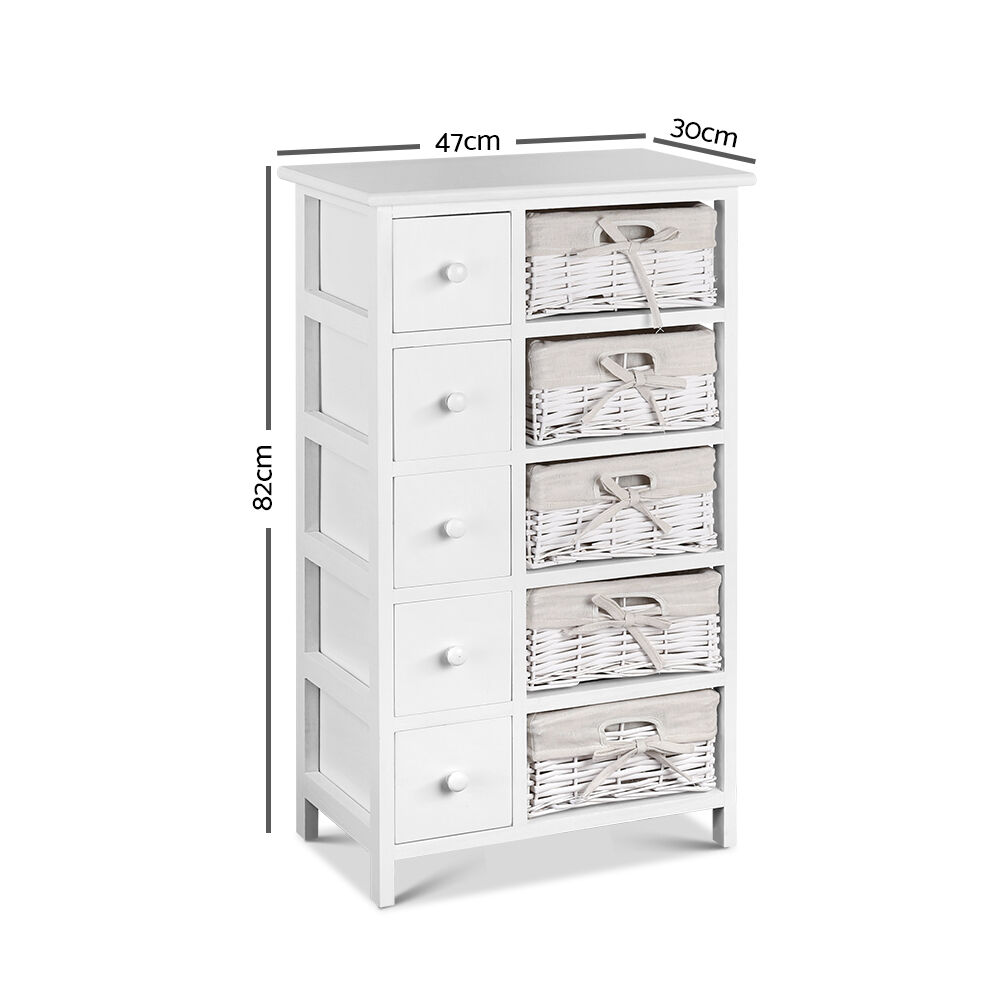 $91.17Looking for that cottagecore aesthetic without moving to the countryside? Add a chic, rustic presence to your home with the Artiss 5-basket Cabinet. Beautifully crafted in an endearing combination of Paulownia wood, MDF board, plywood and PP material, this cabinet evokes a charming, simple living feel and is useful in so many ways. The design has a timeless appeal, and its practicality is enhanced by the five deep drawers and five movable baskets with cloth liners that are washable for easy maintenance. The cabinet will match perfectly with your existing décor thanks to its neutral white tones, so you can use it in any room. Not least, the anti-scratch feet pads will help to keep your floor in pristine condition. The cabinet comes fully assembled so you can place it straight out of the box. Get yours today and create your perfect home.