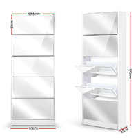 $151.33A practical and stylish shoe cabinet. And a full-length dressing mirror. Two absolute essentials that any discerning fashionista needs. And you can now have both in one with our Artiss Mirror Shoe Cabinet. The five storage compartments are pull-down for easy access and up to 25 of your favourite pairs would fit comfortably in them. Made of 15mm thick particle board with melamine finish, the shoe cabinet is strong and durable to withstand daily robust use. The mirror front of the closed compartments becomes a clear and bright full-length mirror for convenient matchups of clothes and shoes. Or just a quick check before heading out. Not least, the contemporary handle-less design definitely lends a touch of elegance to any home. So clear the clutter and reflect your elegant style with our mirror shoe cabinet.