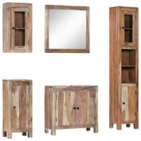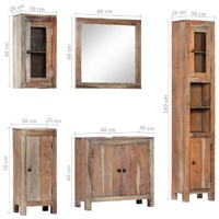 This retro-style wooden bathroom set will add a touch of rustic charm to your bathroom. Crafted from solid acacia wood, the set frames are exceedingly sturdy, stable and durable. The exquisite craftsmanship and the beautiful acacia wood grains make every piece of furniture unique and slightly different from the next. The vanity cabinet has been designed to cover your washbasin's plumbing. Additionally, the tall cabinet, side cabinet as well as the wall cabinet provide ample storage space for keeping your bathroom supplies neatly organised and within reach. Assembly is easy. Delivery includes 1 vanity cabinet, 1 tall cabinet, 1 side cabinet, 1 wall cabinet and 1 mirror. Important note: Colours and wood grains vary from piece to piece, making each of our furniture unique and slightly different from the next. The delivery is random, ensuring the exclusivity and individuality of your product.