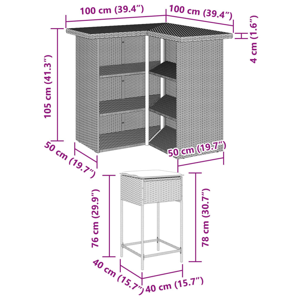 This trendy garden bar set, combining both style and function, is surely meant to be the centrepiece of your garden, patio, and any other living space. Durable material: PE rattan, also known as poly rattan, is a strong, low-maintenance synthetic material that looks like natural rattan. It's lightweight, easy to clean, and commonly used for outdoor furniture due to its durability and weather-resistant properties.Comfortable seat experience: This outdoor furniture, complete with thickly padded cushions, offers a comfortable seating experience.Removable and washable cover: These seat cushions feature removable covers for easy washing and maintenance.Robust and stable frame: The powder-coated steel frame ensures that the garden furniture is strong and stable for daily outdoor use. Good to know:To make sure your outdoor furniture stays beautiful, we recommend protecting it with a waterproof cover.