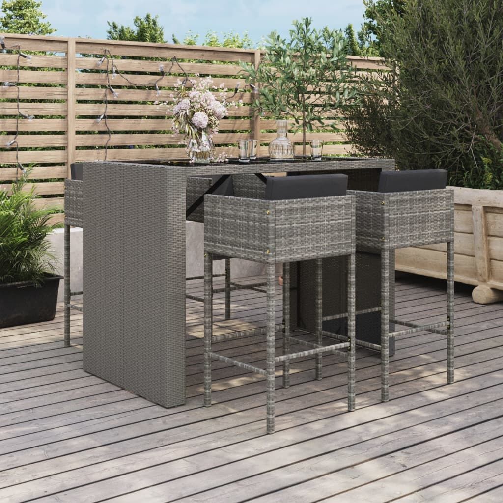 This trendy garden bar set, combining both style and function, is surely meant to be the centrepiece of your garden, patio, and any other living space. Weather-resistant material: PE rattan, also known as poly rattan, is weather resistant and easy to clean. It remains beautiful on the outside for a long period of time. It offers great quality, convenience and an aesthetic look.Comfortable seating: The bar stool is designed with footrest, backrest and armrests to offer you a comfortable seating experience. The soft seat and back cushions also add extra comfort.Tempered glass tabletop: The tabletop is made of tempered glass, making it easy to clean. Additionally, it offers excellent support for holding your drinks, snacks, and your favourite decorations.Sturdy and stable frame: The powder-coated steel frames make the pub set sturdy and stable for daily outdoor use.Wide applications: The bar table and stools, with its remarkable design, create a pleasant overall appearance that integrates effortlessly into any environment. Good to know:To make sure your outdoor furniture stays beautiful, we recommend protecting it with a waterproof cover.