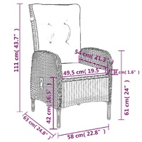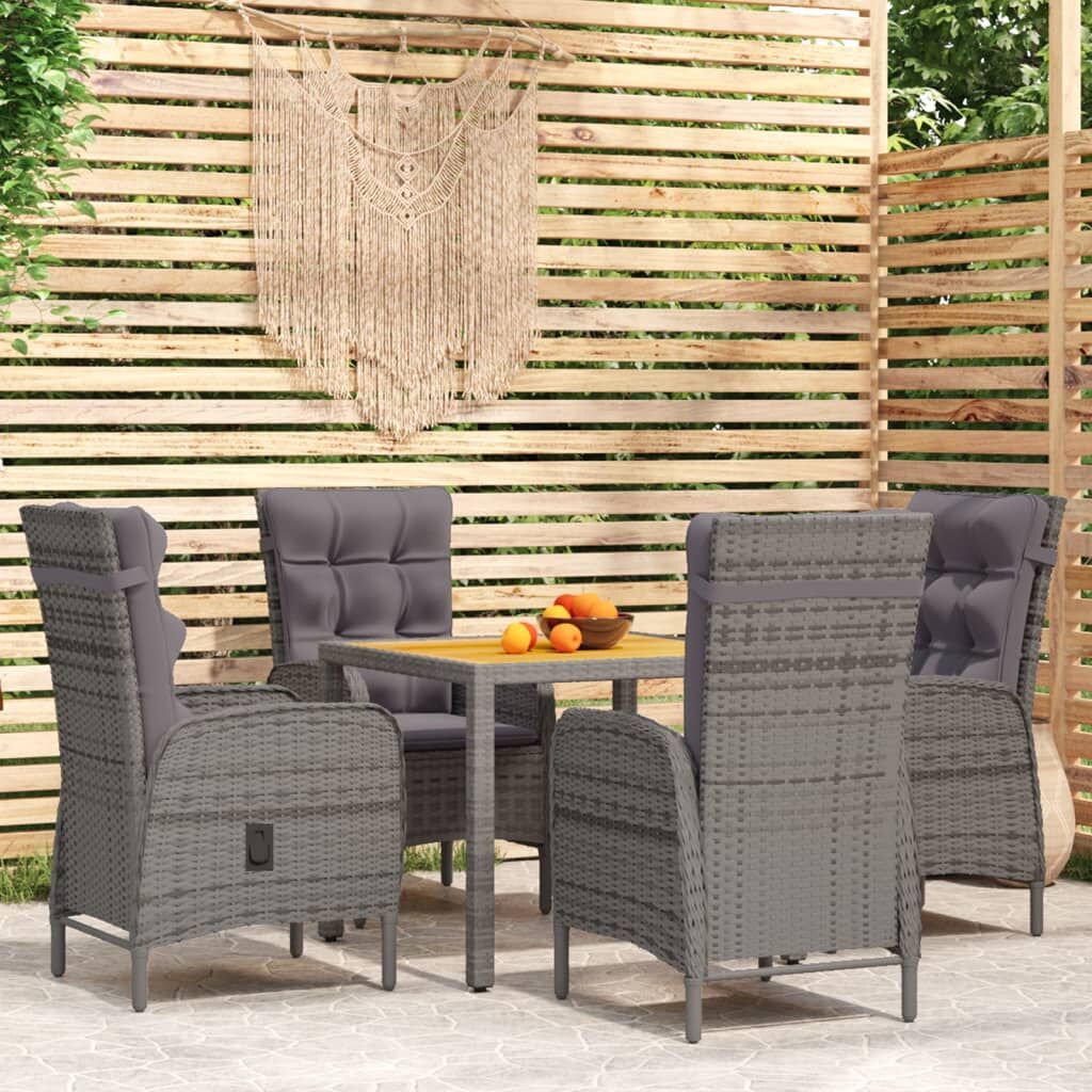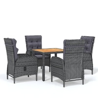 Enjoy a nice meal or afternoon tea in your outdoor space with this garden dining set! Featuring an elegant design, it will become the focal point of your garden and patio! Strong frame: The practical outdoor dining set has a steel frame wrapped with weather resistant PE rattan, making it strong and sturdy.Comfortable chairs: Designed with curved backrest and armrest, the garden reclining chair has a more ergonomic shape for maximum comfort. Cushions are included for added support and the zipped cover is removable for easy washing.Beautifully-designed table: The dining table's tabletop is made of solid acacia wood, a hardwood with dense grains. This beautifully-designed patio table is stable, durable and eye-catching.Gas lift mechanism: Thanks to the gas lift mechanism, the garden armchair's backrest is adjustable to fit your positions. By touching the button on the side, the backrest can recline, for a comfortable position.Lightweight construction: Thanks to the lightweight construction, all the items are easy to move. Note: In order to extend the life of your outdoor furniture, we recommend you to clean it regularly and do not leave it outdoors without protection unnecessarily.Clean: Use a mild soap solution.Storing: If possible, store in a cool, dry place indoors. If the product is stored outdoors, protect it with a waterproof cover. Wipe and dry the excess water or snow from flat surfaces after a rain or snowfall. Allow sufficient air circulation to avoid moisture-related damage.