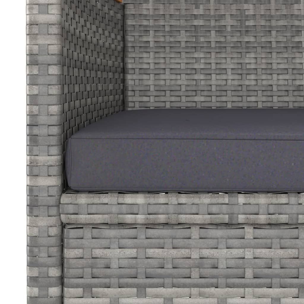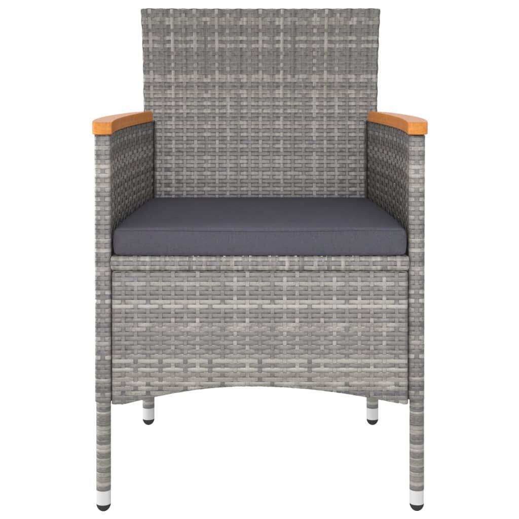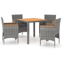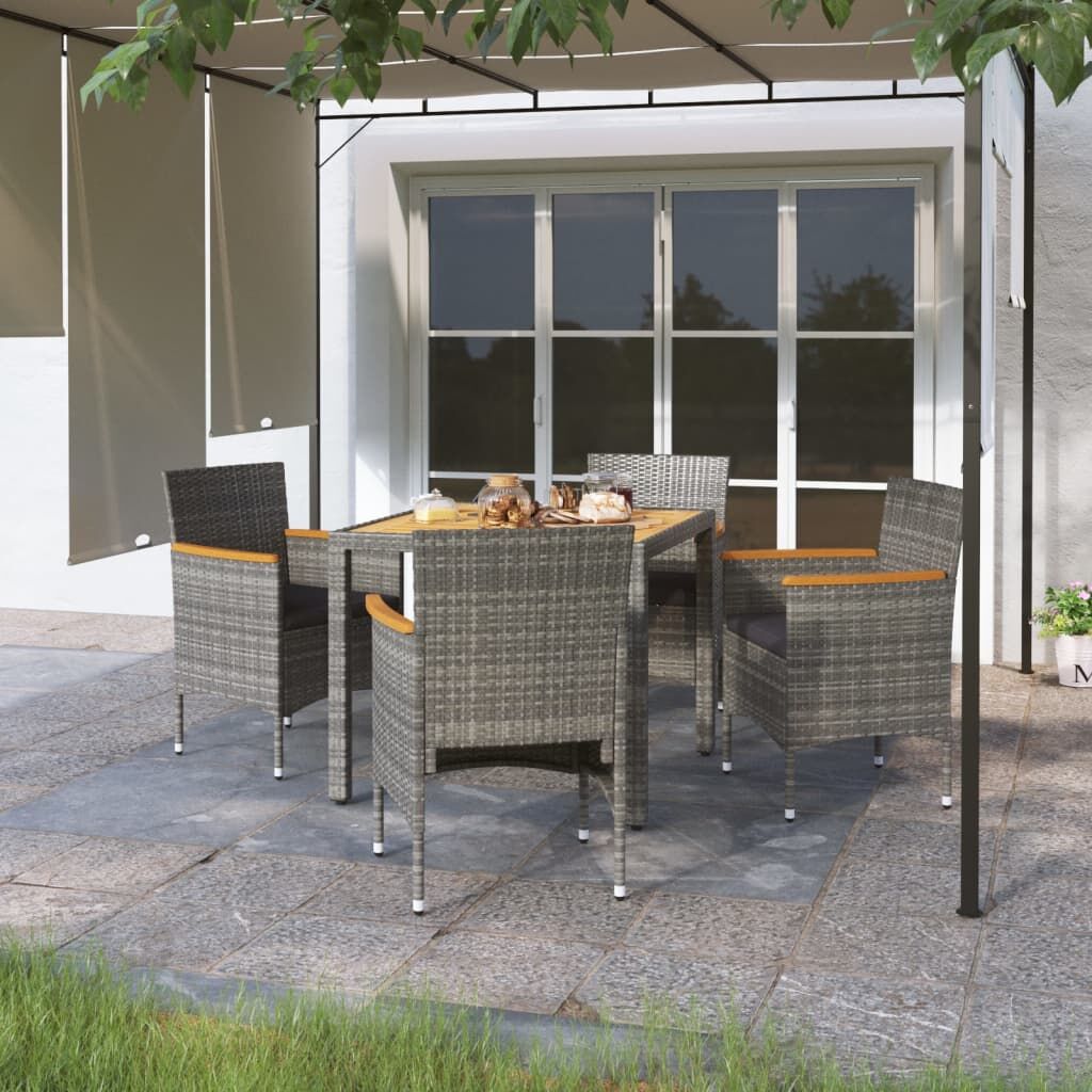 This stylish garden dining set provides you with a leisurely and comfortable time with your family and friends. Featuring a powder-coated steel frame covered with weather-resistant PE rattan with UV protection, the table and chairs are durable and stable. Designed with curved backrest and armrest, the chairs provide you with comfort. The cushions are included for added comfort and the zipped cover is removable for easy washing. The tabletop is made of solid acacia wood in strong support, which is easy to clean and maintain. Additionally, the lightweight construction makes each piece easy to move, rearrange and transport. Note: In order to extend the life of your outdoor furniture, we recommend you to clean it regularly and do not leave it outdoors without protection unnecessarily.Clean: Use a mild soap solution.Storing: If possible, store in a cool, dry place indoors. If the product is stored outdoors, protect it with a waterproof cover. Wipe and dry the excess water or snow from flat surfaces after a rain or snowfall. Allow sufficient air circulation to avoid moisture-related damage.