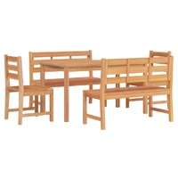 This wooden garden dining set, with an elegant and contemporary design, is a great choice for dining or relaxing in the garden. Solid teak wood: Solid teak wood is a beautiful natural material. It has been seasoned, kiln dried and then fine sanded to give a very smooth appearance. Teak wood is known for its exceptional strength and weather resistance.Sturdy tabletop: This dinner table provides you with a sturdy tabletop. You can place your snacks, drinks, and any of your favourite decorations.Water-resistant feature: With its water-resistant feature and classic look, you can place the garden furniture set anywhere around your sweet home, whether indoors or outdoors!Comfortable seating experience: Each bench and dinner chair has a backrest, which makes it highly comfortable to sit on. Note:Each product comes with an assembly manual in the box for easy assembly.In order to extend the life of your outdoor furniture, we recommend you to protect it with a waterproof cover.
