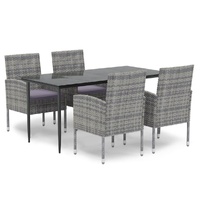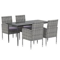 Enjoy a nice meal or afternoon tea in your outdoor space with this garden dining set! Weather-resistant material: PE rattan, also known as poly rattan, is weather resistant and easy to clean. It remains beautiful on the outside for a long period of time. It offers great quality, convenience and an aesthetic look.Sturdy frame: The powder-coated steel frames make the outdoor dining set sturdy and stable for daily outdoor use.Practical tabletop: The smooth tabletop of the dining table is made of tempered glass which is easy to clean with a damp cloth. Additionally, the sturdy tabletop is perfect for placing meals, drinks, and other decorative items.Comfortable design: Designed with curved backrests and armrests, these outdoor chairs provide maximum comfort.Extra comfort: The thickly padded cushions provide ultimate comfort during your sitting time. Note:In order to extend the life of your outdoor furniture, we recommend you to protect it with a waterproof cover.Each product comes with an assembly manual in the box for easy assembly.