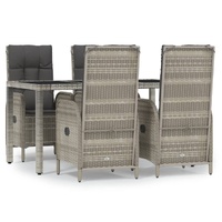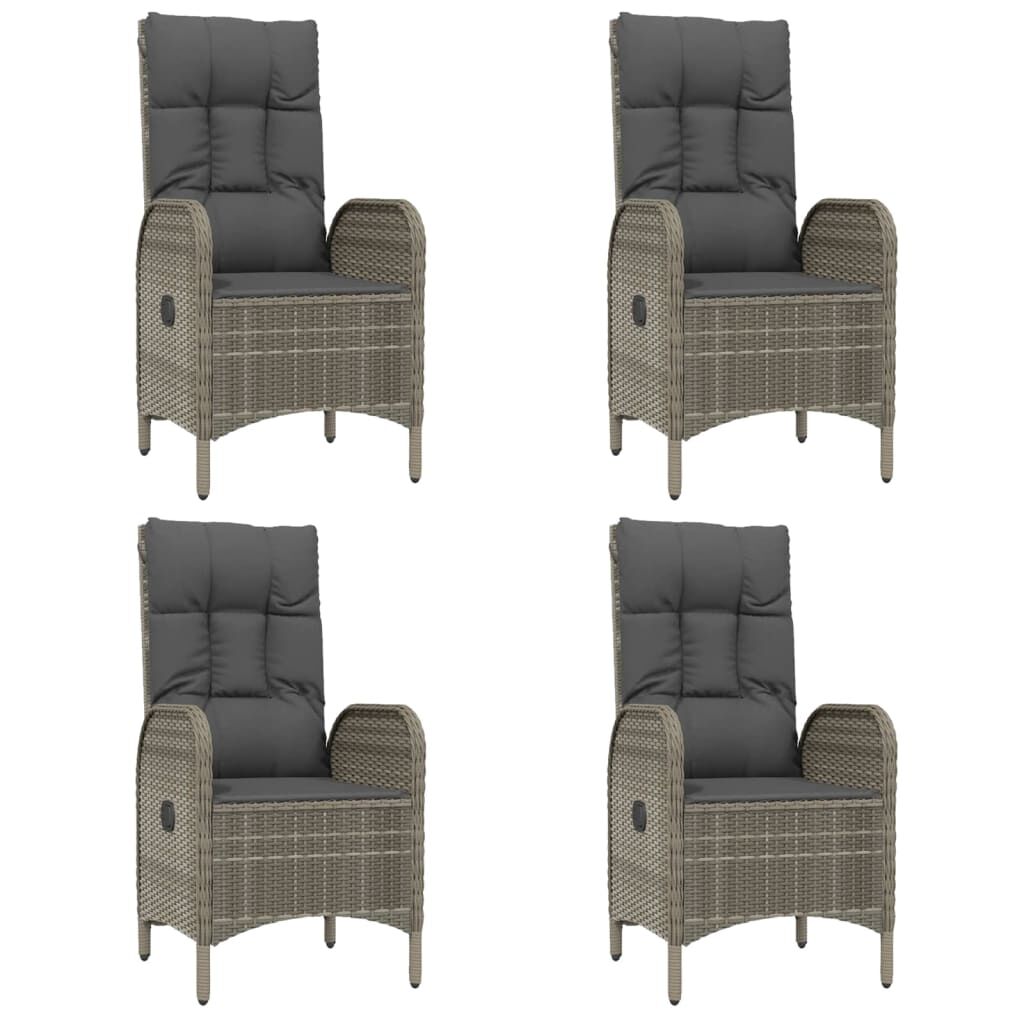 This trendy garden dining set, featuring an elegant and contemporary design, is a great choice for dining or relaxing in your garden. Weather-resistant material: PE rattan, also known as poly rattan, is weather resistant and easy to clean. It remains beautiful on the outside for a long period of time. It offers great quality, convenience and an aesthetic look.Sturdy frame: The powder-coated steel frames make the outdoor dining set sturdy and stable for daily outdoor use.Practical tabletop: The smooth tabletop of the garden table is made of tempered glass which is easy to clean with a damp cloth. Additionally, the sturdy tabletop is perfect for placing meals, drinks, and other decorative items.Reclining function: The garden chairs are specially designed with a reclining function so that you can adjust the backrest as per your comfort.Comfortable seat experience: The backrest adds extra seating comfort for the garden chair. Also, the thickly padded cushions provide comfort for your sitting time. Good to know:To make assembly as easy as possible, each product is delivered with a manual. Note:To make sure your outdoor furniture stays beautiful, we recommend protecting it with a waterproof cover.