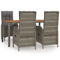 This trendy garden dining set, featuring an elegant and contemporary design, is a great choice for dining or relaxing in your garden. Weather-resistant material: PE rattan, also known as poly rattan, is weather resistant and easy to clean. It remains beautiful on the outside for a long period of time. It offers great quality, convenience and an aesthetic look.Sturdy frame: The powder-coated steel frames make the outdoor dining set sturdy and stable for daily outdoor use.Practical tabletop: The solid acacia wood tabletop is perfect for placing drinks, food and decorations. It's beautiful in appearance and easy to clean.Reclining function: The garden chairs are specially designed with a reclining function so that you can adjust the backrest as per your comfort.Comfortable seat experience: The backrest adds extra seating comfort for the garden chair. Also, the thickly padded cushions provide comfort for your sitting time. Good to know:To make assembly as easy as possible, each product is delivered with a manual. Note:To make sure your outdoor furniture stays beautiful, we recommend protecting it with a waterproof cover.