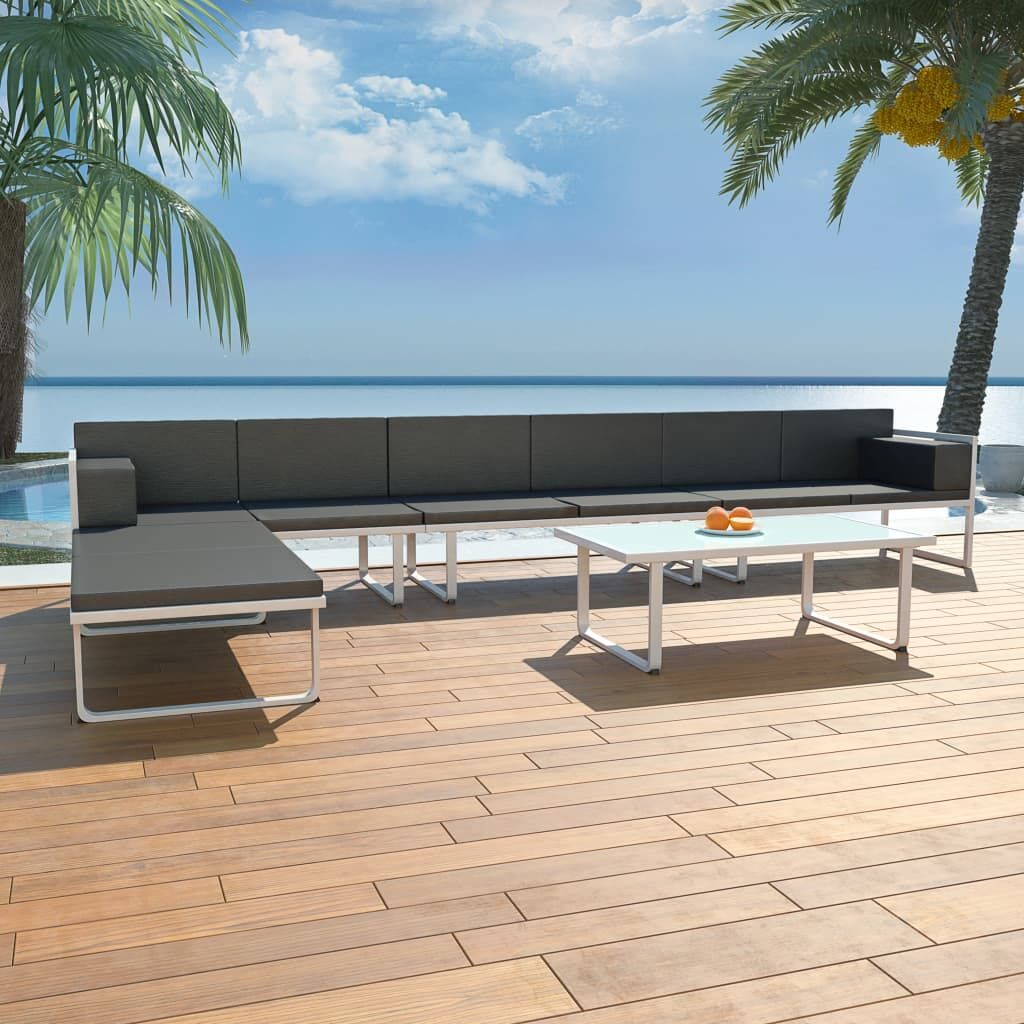 This high-quality outdoor sofa set combines style and functionality and will become the focal point of your garden or patio. The whole furniture set is designed to be used outdoors year-round. Thanks to the 100% aluminium frame, the sofa set is easy to clean, hard-wearing and suitable for daily use. The seats are made of textilene, which is comfortable and weather resistant. The thick, removable seat cushions, back cushions and armrest cushions are comfortable and washable. Delivery includes two 2-seater sofas (left and right), 1 armless sofa, 1 ottoman, 1 coffee table with a 5 mm thick glass tabletop, 4 seat cushions, 6 back cushions and 2 armrest cushions. Note: We recommend covering the set in the rain, snow and frost.