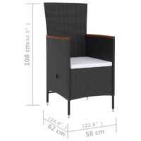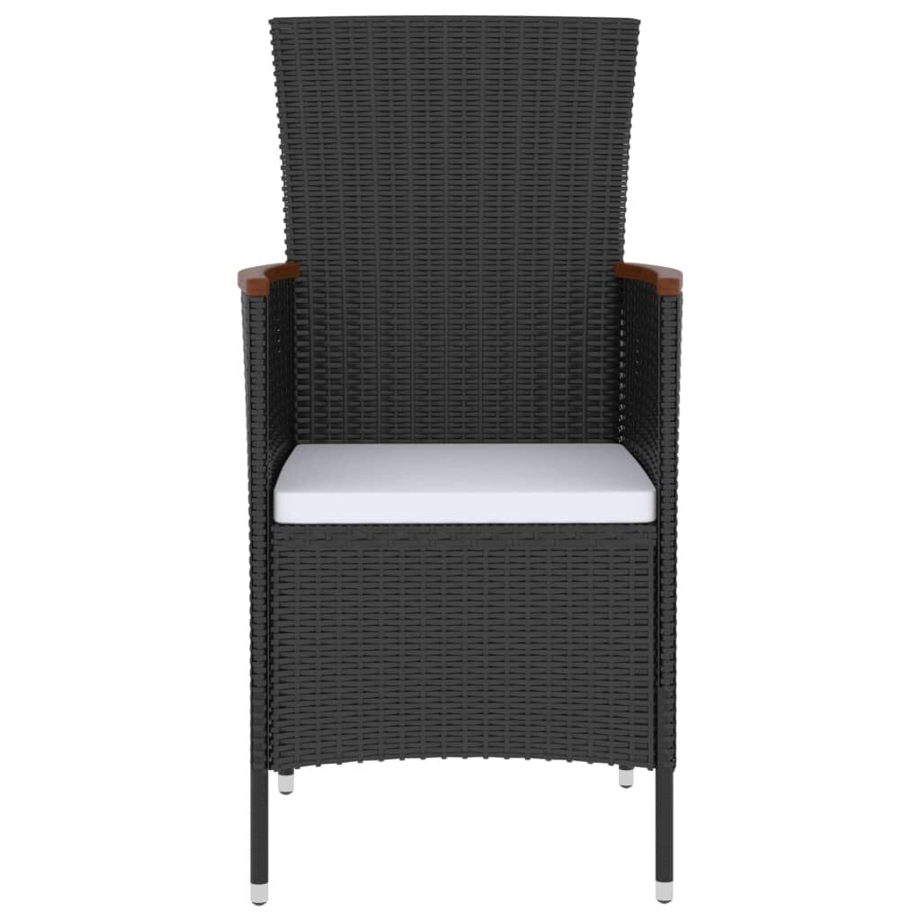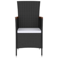This outdoor dining set, with an elegant and contemporary design, is an eye-catching addition to your outdoor living space. This garden furniture set features a sturdy powder-coated steel frame, which is very stable and durable. The PE rattan makes this dining set easy to clean, hardwearing and suitable for daily outdoor use. The tabletop is made of solid acacia wood, a tropical hard wood, which is weather-resistant and durable. The reclining chairs offer the utmost seating comfort and great support. The backrest is easily adjustable as per your desire by using the button on the side. Additionally, the thick and soft seat and back cushions are also highly comfortable. The low-maintenance polyester cushion covers can be easily removed and washed. Note: We recommend covering the set in the rain, snow and frost for extended life.