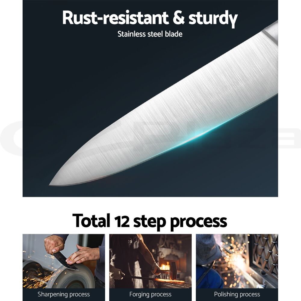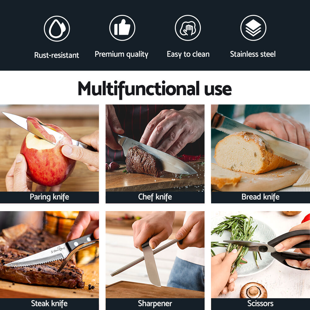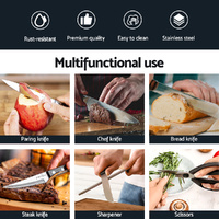 Do you love to cook? Our 14-Piece Kitchen Knife Set will keep your cooking skills sharp. The knife set comes with a chef knife, bread knife, carving knife, utility knife, paring knife, six steak knives and a wooden knife block to keep your collection organised and protected. Slice, dice, cut and gut, theres a knife for every cooking situation. Each knife is made from quality stainless steel and is constructed from a single piece for extra comfort and protection. Unlike other basic kitchen knife sets, our knives feature a non-scratch, non-stick coating that is easy to clean and incredibly rust-resistant he knives have a well-balanced hollow ergonomic handle making them easy to hold and use. Includes a sharpener to keep your knives sharp and ready to go at all times. The knives have a hardness rating (HRC) of 53±2, making them perfect for student chefs and home cooks on a budget. With its sleek modern design, the knife set is the perfect gift for a budding chef, first homeowner, or even for yourself. Spruce up your kitchen and elevate your cooking skills today with our comprehensive 14-Piece Knife Set.