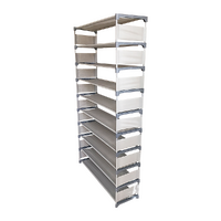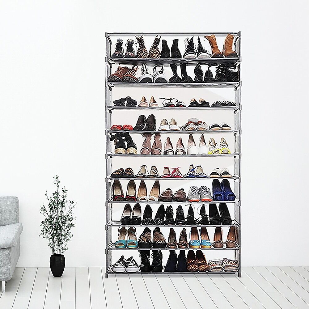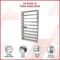$45.11A perfect storage solution for the person who has too many shoes this 10 Tier Stackable Shoe Rack - 50 Pair! Unclutter your life and free up that wasted space into a neat tidy tower of shoes and be the envy of everyone! Picking out a shoe to fit your outfit is so much easier and convenient - with all your shoes conveniently located in one place, you'll never have to go looking for missing shoes ever again! Constructed of sturdy steel tubes and resin siding connectors, this lightweight shoe rack and be built into any number of levels as needed.