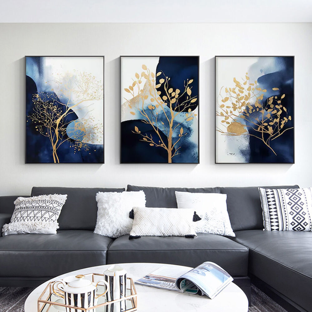 50cmx70cm Navy and Gold Watercolor Shapes 3 Sets Black Frame Canvas Wall Art