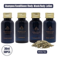 Experience luxury with this premium hotel toiletries set, featuring a delicate white tea fragrance. Each 30ml bottle offers a refreshing and rejuvenating experience for hotel guests. These elegant bottles are perfect for upscale establishments, providing both functionality and style. This set includes shampoo, conditioner, body wash, and body lotion, ensuring guests have everything they need for a complete and satisfying personal care routine.