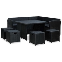 Enjoy chatting with your family members and friends in your outdoor space on this poly rattan garden lounge set with cushions! This comfy outdoor lounge set, featuring a powder-coated steel frame covered with PE rattan, is sturdy and easy to clean, making it ideal for daily outdoor use. Thanks to its lightweight construction, you can move the set easily. The thickly padded cushions add extra comfort in your lounging time. The corner sofa and stools provide enough seating space for family gatherings. In addition, the coffee table is ideal for placing drinks, food and decorative items. Note: We recommend covering the set in the rain, snow and frost.