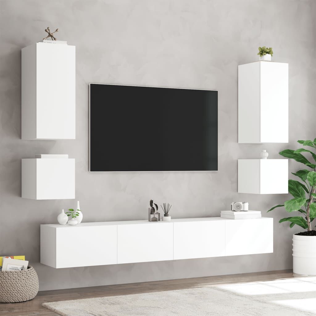 These TV wall cabinets with LED lights are the perfect solution for your living space to maximise space and keep the floor areas uncluttered. Durable material: The engineered wood is of exceptional quality with smooth surface and also features strength, stability and resistance to moisture. Made of engineered wood, these floating TV units are sturdy and durable.Ample storage space: The TV wall units have ample storage space to place your DVD players, books, magazines or other decorative items.RGB LED lights: The wall media units are equipped with vibrant RGB LED lights. With various customisable menus, you can effortlessly change the colour of the lights and even set them to adjust automatically.Wall-mounted design: These TV units with storage can be wall-mounted to add extra storage space. That way, you can maximise your floor space and keep the area clean. Good to know:Screws and plugs for inside the wall are not included. We advise to find and use screws and plugs suitable specifically for your walls. If you're not sure, you can consult with a professional. Please read and follow each step of the instructions.The product has a USB connector that requires a certified 5V USB power source (not included).