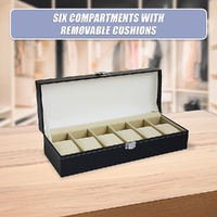 The soft fabric lining will keep your watch collection safe and protected from scratches and the elements. The box provides six compartments that feature removable cushions for the storage of other jewelry and valuables.