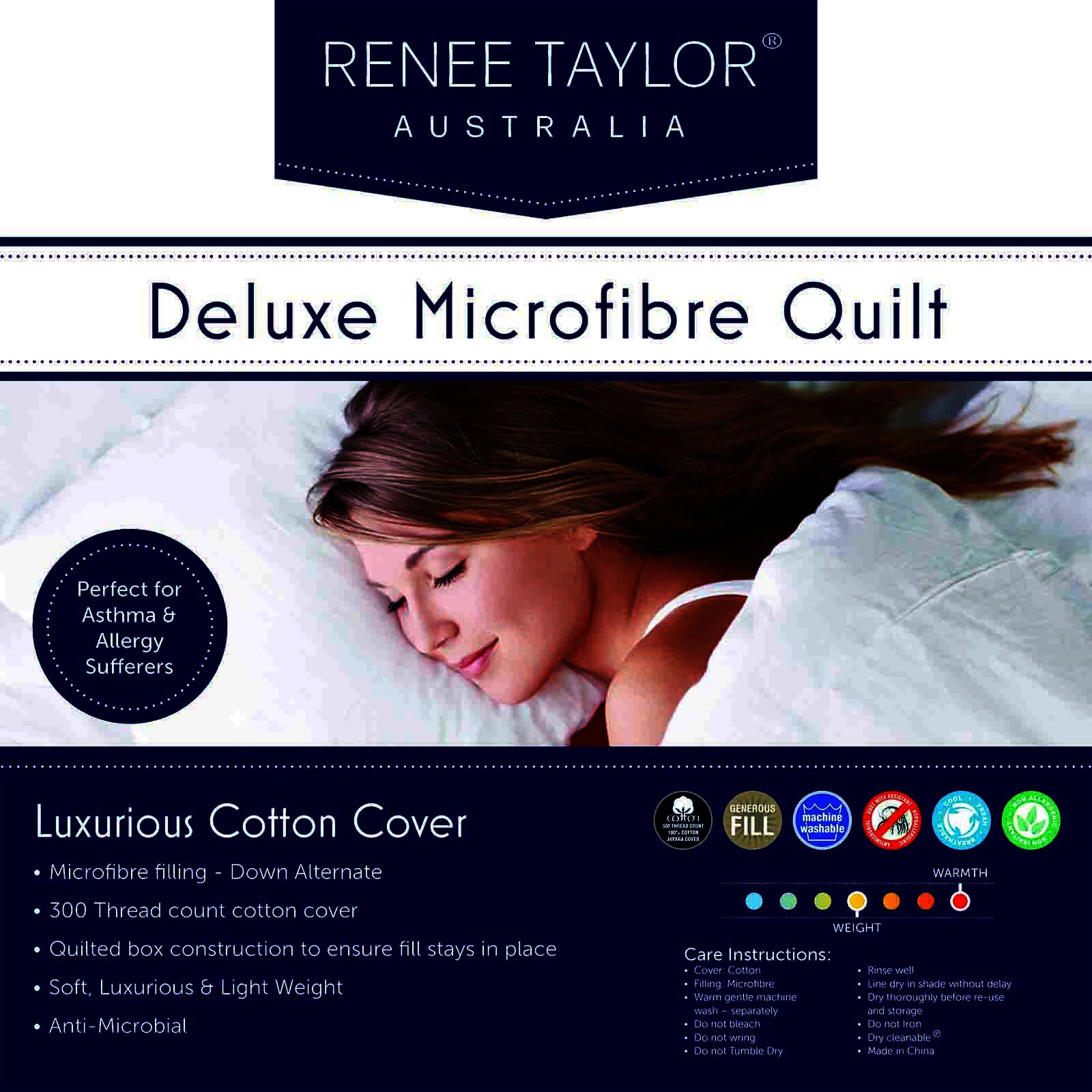 The Renee Taylor 600 gsm Deluxe Quilt offers a beautiful breathable 300 Thread count 100% cotton cover with microfiber filling. The Collection features delicately piped edges, fine stitching, and a double-processed high loft fill. The light fluffy micro-down like fibre fill was carefully chosen to ensure the superior quality of these five stars range. Each quilt is given a health guard coating for the highest level of allergy and dust mite defence. Even fill distribution is made possible by the end-to-end box stitching construction, so the quilt remains tidy and comfortable even after numerous washings.
