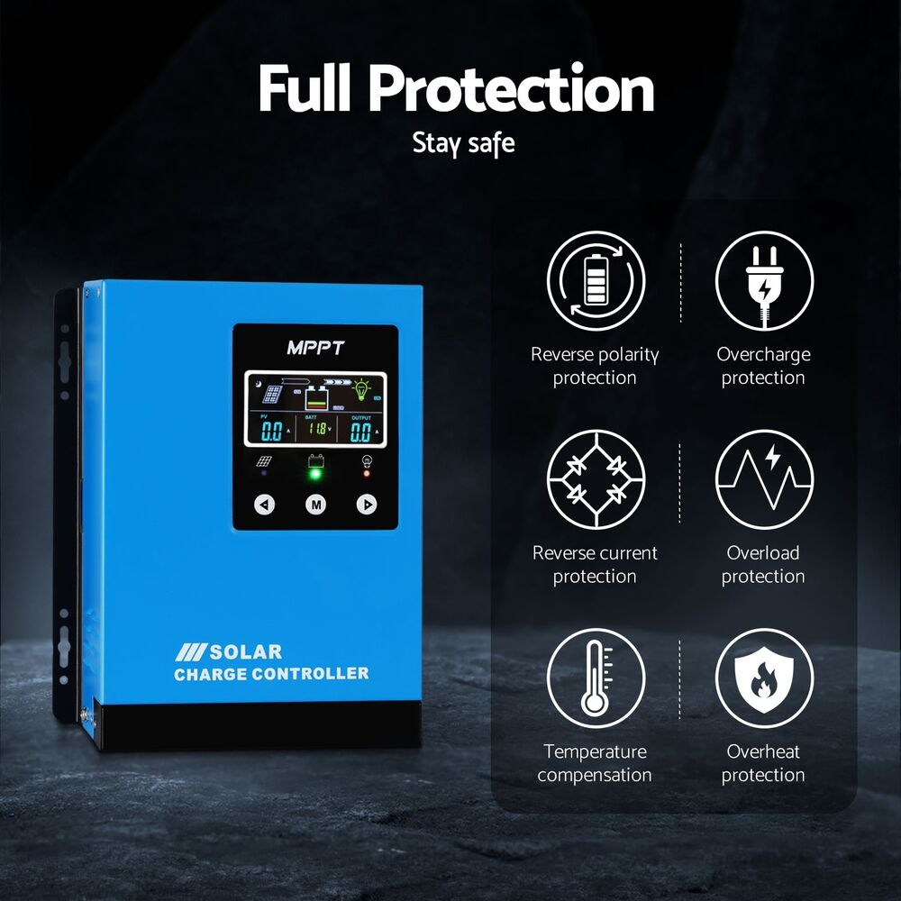 Keep your batteries from overcharging with a 60A MPPT solar charge controller from Giantz. Creative MPPT technology results in up to 99 per cent tracking efficiency and up to 97 per cent maximum charging efficiency. Multi-stage charging maximises your battery health, charge and lifespan. The controller features intelligent protection in case of overcharge, reverse polarity, overloading, overheating, etc. The humanised design with a backlit LCD display is easy and convenient to use. Works with most popular battery types for seamless integration. The iron case heat sink and cooling fan ensure proper heat distribution. Features RS485, RJ45 port communication modes for fast and accurate communication across devices. The controller automatically detects system voltages. Max PV input power: 12V/780W, 24V/1560W, 36V/2340W, 48V/3120W. Power up anywhere with a 60A MPPT solar charge controller from Giantz.