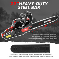 $165.43An essential tool of the trade, the X-BULL Series Petrol Chainsaw is a must-have for any tradesperson or gardener, whether you're commercial or home-based. Thanks to its direct air injection carburettor, it is built for high-power, high-speed cutting. It features a balanced design for ease of use and maneuverability, while the built-in anti-vibration system keeps fatigue at bay perfect for those long jobs. It uses a double recoil pulling system for easy start-up, while the adjustable automatic oil feeding system allows you to set and forget your chain lubrication for a smooth cut in any condition. The chainsaw features a quick tension chain mechanism to adjust the chain easily and efficiently, and the integrated chain brake helps to keep you safe. With easy access to the engine, filters and spark plugs, maintenance is easy. Your purchase comes with a bonus saw chain, spark plug, tool set and safety gear, so you'll have everything you need to get started. Trust the pros and add the X-BULL Series Petrol Chainsaw to your collection today.