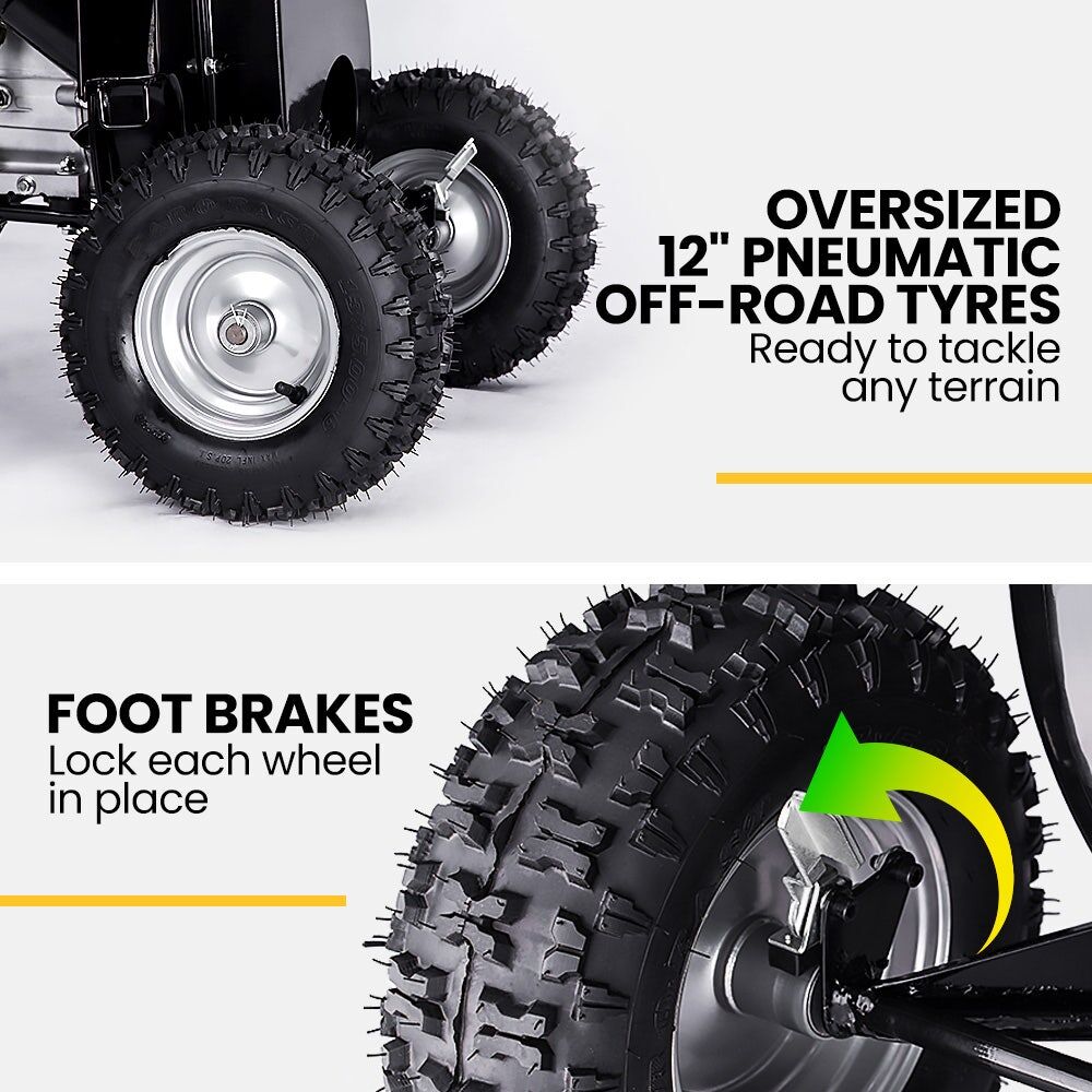 The Raptor 950 Wood Chipper boasts world-class heavy-gauge steel construction that ensures excellent durability and portability. Oversized all-terrain 12 inch pneumatic wheels provide easy mobility and dual foot brakes lock it into position. It's shipped in a tough reinforced crate and minimal assembly is required - you'll be making fast work of large or small yard debris in no time!