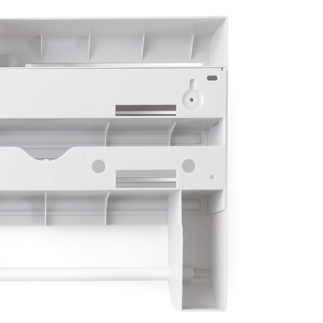 $33.24Our Wall Mount Paper Towel Holder with Rack makes your kitchen efficient and convenient in unimaginable ways. The holder has two dispensers for your foil, plastic wrap, or wax paper! Each dispenser has a sliding cutter to dispense and trim your paper quickly and easily. The top of the holder is flat, so you can keep frequently-used flavoring close at hand. What's more, And, of course, the device holds your paper towels--jumbo size--too!