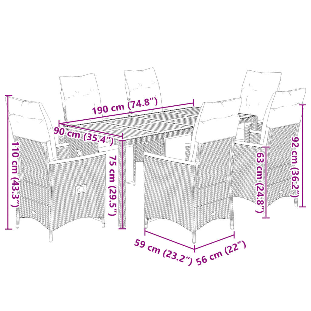 Enjoy a coffee or have a chat with your family and friends in the garden, backyard, or on the balcony with this comfortable bistro set! Durable material: PE rattan, also known as poly rattan, is a strong, low-maintenance synthetic material that looks like natural rattan. It's lightweight, easy to clean, and commonly used for outdoor furniture due to its durability and weather-resistant properties.Adjustable backrest and footrest: This garden seat has a handle. You can adjust the backrest and footrest to any position by pulling the handle, and quickly return it to its original position.Comfortable seat experience: This outdoor furniture, complete with thickly padded cushions, offers a comfortable seating experience.Removable and washable cover: These seat cushions feature removable covers for easy washing and maintenance. The back cushions have a flap at the back for easy attachment to the backrests.Stable and easy-to-clean tabletop: This garden table has an acacia wood top that is sturdy, durable, and easy to clean with a damp cloth. Good to know:To make sure your outdoor furniture stays beautiful, we recommend protecting it with a waterproof cover.