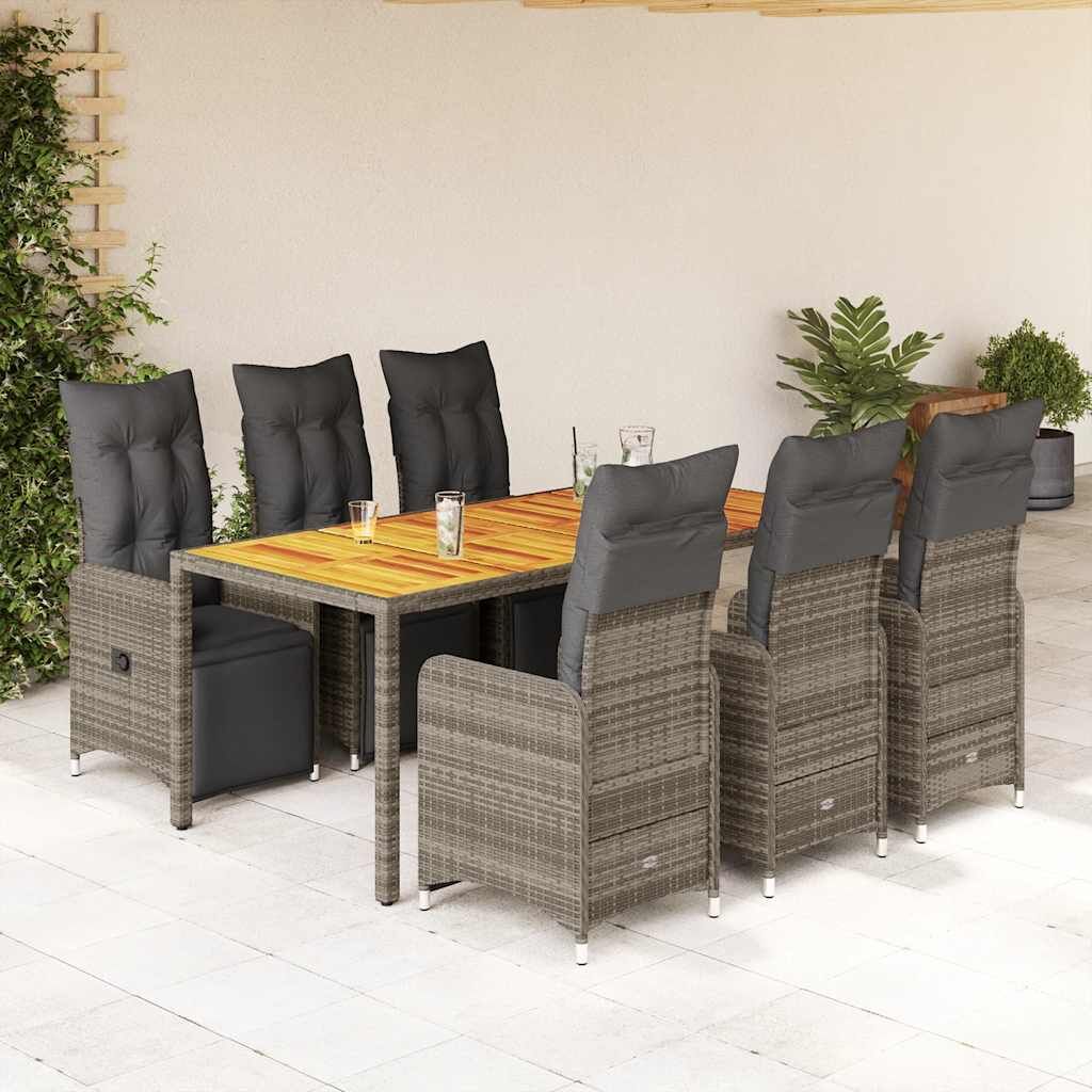 Enjoy a coffee or have a chat with your family and friends in the garden, backyard, or on the balcony with this comfortable bistro set! Durable material: PE rattan, also known as poly rattan, is a strong, low-maintenance synthetic material that looks like natural rattan. It's lightweight, easy to clean, and commonly used for outdoor furniture due to its durability and weather-resistant properties.Adjustable backrest and footrest: This garden seat has a handle. You can adjust the backrest and footrest to any position by pulling the handle, and quickly return it to its original position.Comfortable seat experience: This outdoor furniture, complete with thickly padded cushions, offers a comfortable seating experience.Removable and washable cover: These seat cushions feature removable covers for easy washing and maintenance. The back cushions have a flap at the back for easy attachment to the backrests.Stable and easy-to-clean tabletop: This garden table has an acacia wood top that is sturdy, durable, and easy to clean with a damp cloth. Good to know:To make sure your outdoor furniture stays beautiful, we recommend protecting it with a waterproof cover.