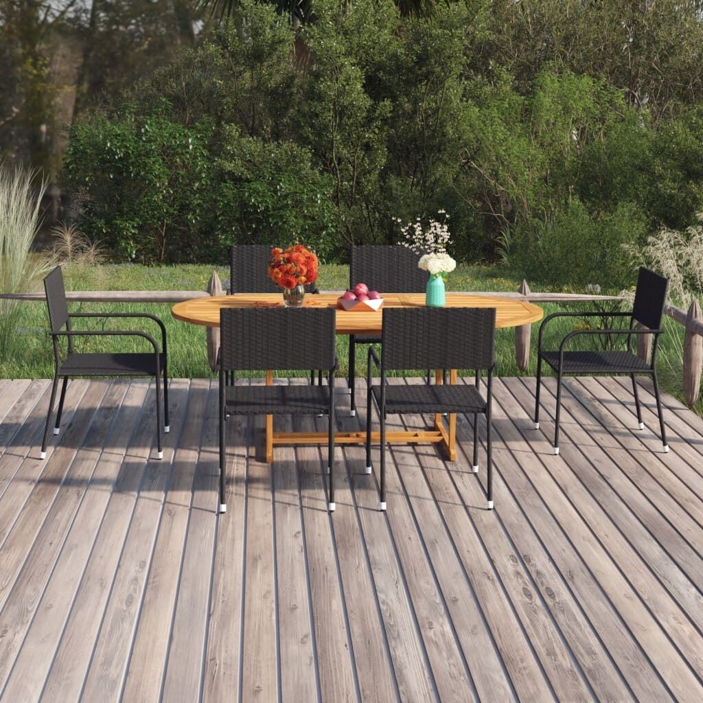 $672.09Create a compelling and cohesive aesthetic in your outdoor space with this garden dining set! The dining table is made of solid acacia wood, making it sturdy and stable. The oil-finished surface also makes it suitable for outdoor use. Featuring a steel frame covered with weather-resistant PE rattan, the dining chairs are sturdy and easy to clean. The garden chairs can be stacked to save space when not in use. Note: In order to extend the life of your outdoor furniture, we recommend you to clean it regularly and do not leave it outdoors without protection unnecessarily.Clean: Use a mild soap solution.Storing: If possible, store in a cool, dry place indoors. If the product is stored outdoors, protect it with a waterproof cover. Wipe and dry the excess water or snow from flat surfaces after a rain or snowfall. Allow sufficient air circulation to avoid moisture-related damage.