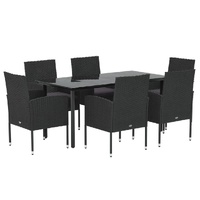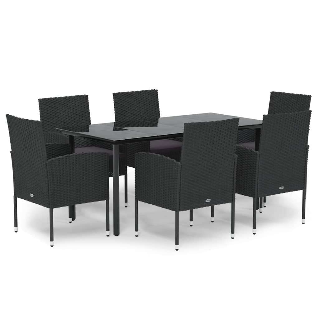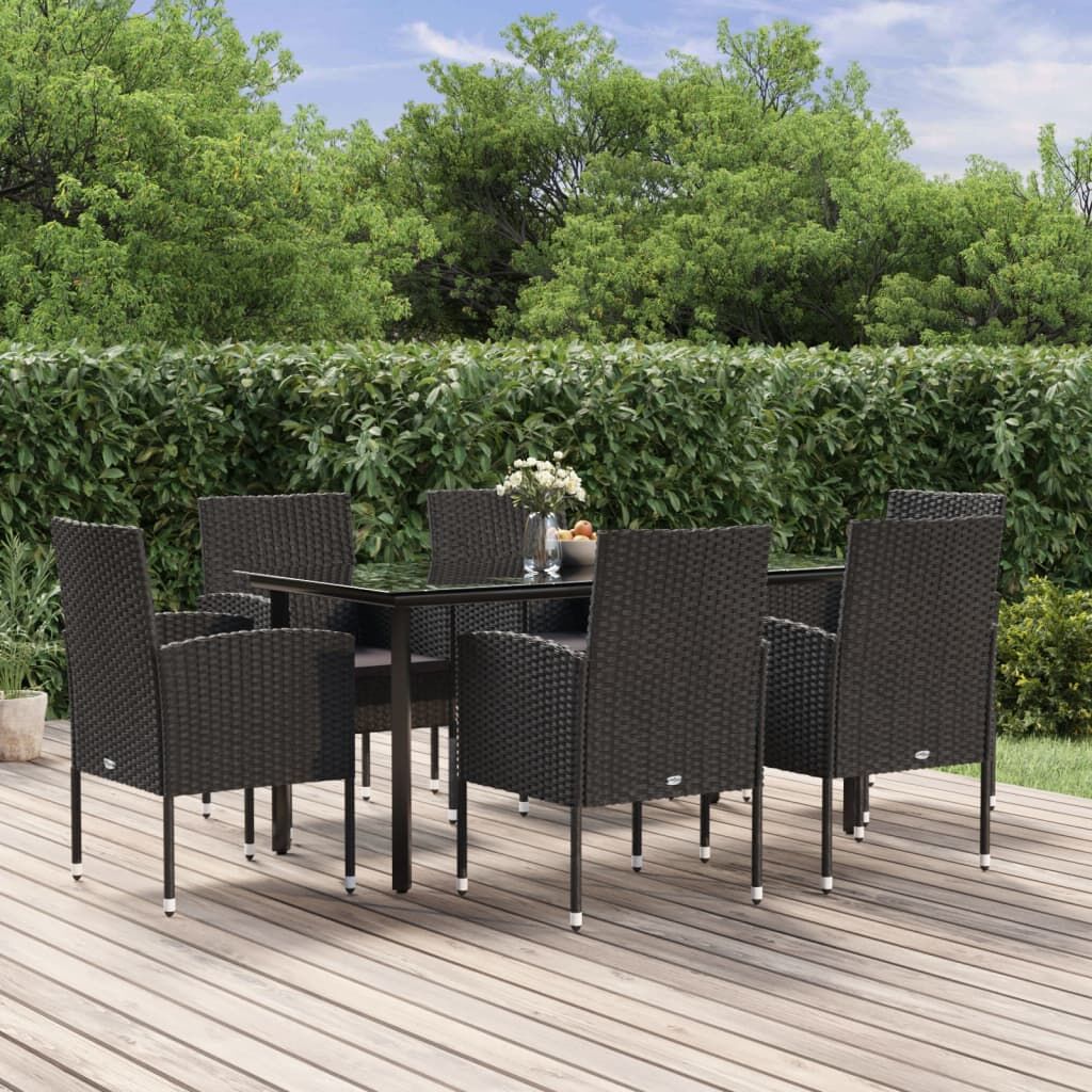 Enjoy a nice meal or afternoon tea in your outdoor space with this garden dining set! Weather-resistant material: PE rattan, also known as poly rattan, is weather resistant and easy to clean. It remains beautiful on the outside for a long period of time. It offers great quality, convenience and an aesthetic look.Sturdy frame: The powder-coated steel frames make the outdoor dining set sturdy and stable for daily outdoor use.Practical tabletop: The smooth tabletop of the dining table is made of tempered glass which is easy to clean with a damp cloth. Additionally, the sturdy tabletop is perfect for placing meals, drinks, and other decorative items.Comfortable design: Designed with curved backrests and armrests, these outdoor chairs provide maximum comfort.Extra comfort: The thickly padded cushions provide ultimate comfort during your sitting time. Note:In order to extend the life of your outdoor furniture, we recommend you to protect it with a waterproof cover.Each product comes with an assembly manual in the box for easy assembly.