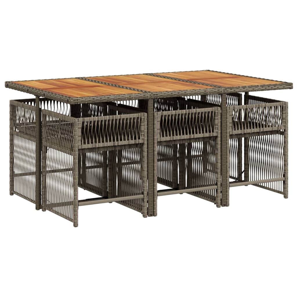 This garden dining set is a great choice for al fresco dining or just relaxing in the garden, backyard, or patio. Durable material: PE rattan, also known as poly rattan, is a strong, low-maintenance synthetic material that looks like natural rattan. It's lightweight, easy to clean, and commonly used for outdoor furniture due to its durability and weather-resistant properties.Compact storage: These chairs have a flap backrest that can be folded down, making it easy to store them under the table. When folded, they neatly fit under the table, forming a space-saving cube shape.Comfortable seat experience: This outdoor furniture, complete with thickly padded cushions, offers a comfortable seating experience.Removable and washable cover: These seat cushions feature removable covers for easy washing and maintenance. The cushion covers have a flap at the back for easy attachment to the backrests.Stable and easy-to-clean tabletop: This garden table has an acacia wood top that is sturdy, durable, and easy to clean with a damp cloth. Good to know:To make sure your outdoor furniture stays beautiful, we recommend protecting it with a waterproof cover.