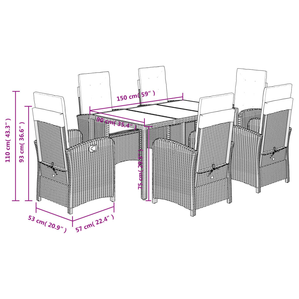This garden dining set is a great choice for al fresco dining or just relaxing in the garden, backyard, or on the patio. Durable material: PE rattan, also known as poly rattan, is a strong, low-maintenance synthetic material that looks like natural rattan. It's lightweight, easy to clean, and commonly used for outdoor furniture due to its durability and weather-resistant properties.Adjustable backrest: This garden seat has a handle. You can adjust the backrest to any position by pulling the handle, and quickly return it to its original position.Comfortable seat experience: This outdoor furniture, complete with thickly padded cushions, offers a comfortable seating experience.Removable and washable cover: These seat cushions feature removable covers for easy washing and maintenance. The back cushions have a flap at the back for easy attachment to the backrests.Glass tabletop: The outdoor table's top is made from strong and durable tempered glass, making it easy to clean with a damp cloth and adding a touch of elegance to your outdoor space. Good to know:To make sure your outdoor furniture stays beautiful, we recommend protecting it with a waterproof cover.
