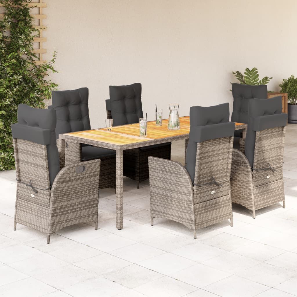 This garden dining set is a great choice for al fresco dining or just relaxing in the garden, backyard, or on the patio. Durable material: PE rattan, also known as poly rattan, is a strong, low-maintenance synthetic material that looks like natural rattan. It's lightweight, easy to clean, and commonly used for outdoor furniture due to its durability and weather-resistant properties.Adjustable backrest: This garden seat has a handle. You can adjust the backrest to any position by pulling the handle, and quickly return it to its original position.Comfortable seat experience: This outdoor furniture, complete with thickly padded cushions, offers a comfortable seating experience.Removable and washable cover: These seat cushions feature removable covers for easy washing and maintenance. The back cushions have a flap at the back for easy attachment to the backrests.Stable and easy-to-clean tabletop: This garden table has an acacia wood top that is sturdy, durable, and easy to clean with a damp cloth. Good to know: To make sure your outdoor furniture stays beautiful, we recommend protecting it with a waterproof cover.
