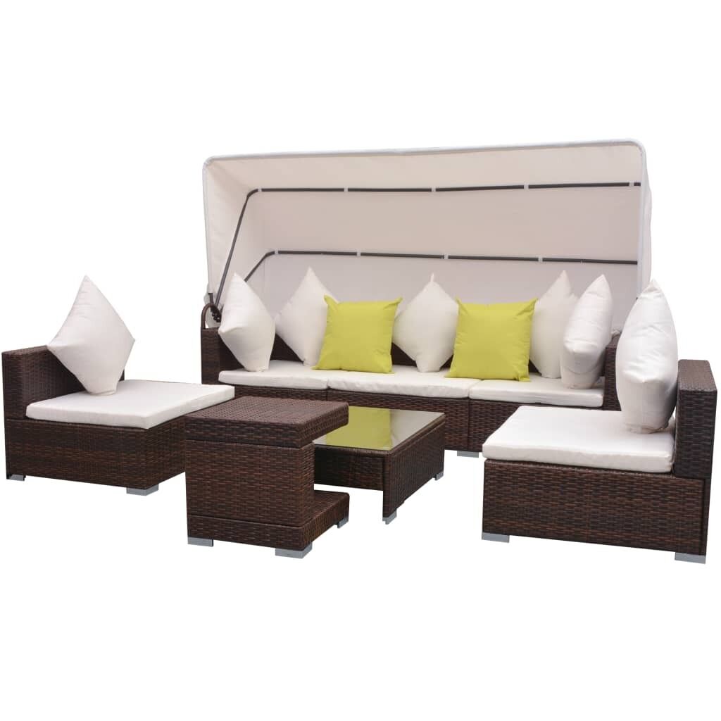 $675.85This stylish yet highly comfortable modular rattan sofa set with canopy will be a real eye-catcher in your garden or on the patio. The garden furniture set is made of weather-resistant PE rattan, which makes it easy to clean and hard-wearing enough for daily outdoor use. The sofa segments and tables feature a sturdy and durable powder-coated steel frame. The removable seat cushions and pillows are very comfortable and their polyester covers are soft and easy to clean. This lightweight, modular rattan sofa set can be easily moved around and flexibly placed to suit any setting. Thanks to the large canopy, which can be extended to block direct sunlight, you can enjoy being outdoors without being bothered by the glare. The coffee table can be equipped with either a transparent glass top, and a 6 cm thick seat cushion, so you can transform it into an ottoman or incorporate it into the configuration as a large day bed. Delivery includes 2 corner sofa segments, 1 centre sofa segment, 2 side sofa segments, 1 coffee table with a transparent glass top, 1 side table, 5 seat cushions for the sofa segments, 1 seat cushion for the coffee table, 9 pillows and 1 canopy. Note: We recommend covering the set in the rain, snow and frost.