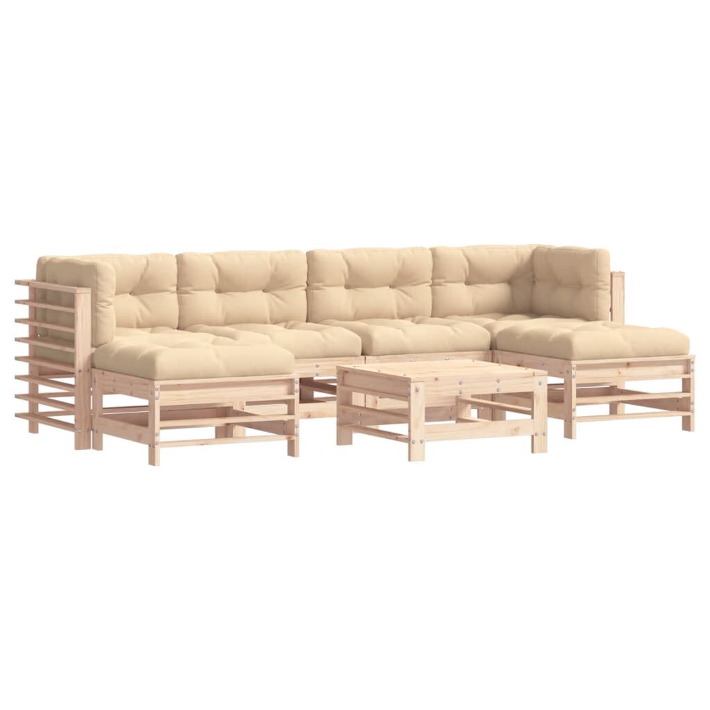 This wooden garden lounge set, standing out with the slatted design and soft cushions, will make a great addition to your garden, patio, or terrace for enjoying a cosy time with your family or friends. Solid pine wood: Solid pine wood is a beautiful natural material. Pine wood has a straight grain, and the knots give the material its signature, rustic look.Sturdy and stable frame: The wooden frame makes the lounge set sturdy and stable for daily outdoor use.Comfortable seat experience: The backrest and armrest add extra seating comfort for the garden furniture set. Also, the thickly padded cushions provide comfort for your sitting time.Modular design: The sofa set is flexible and easy to move around. You can combine it with other modular segments in the webshop to create your own personal garden lounge set configurations! Good to know:To make sure your outdoor furniture stays beautiful, we recommend protecting it with a waterproof cover.