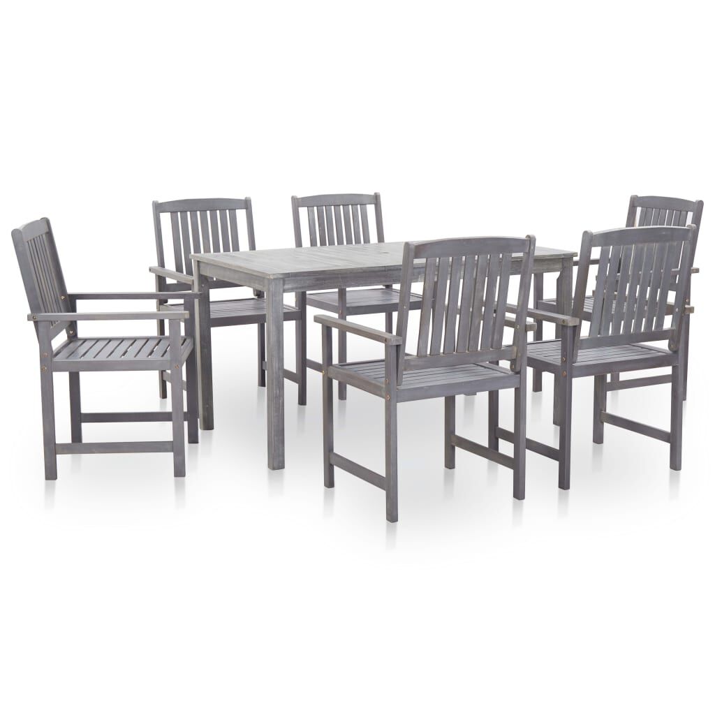 This 7-piece garden furniture set consists of 1 table and 6 chairs and will become the focal point of your garden or patio. This durable wooden dining set is made of solid acacia wood, which makes it sturdy and easy to clean. Thanks to a hole in the table centre, you can easily place a parasol to create some shade. Delivery includes 1 table and 6 chairs.