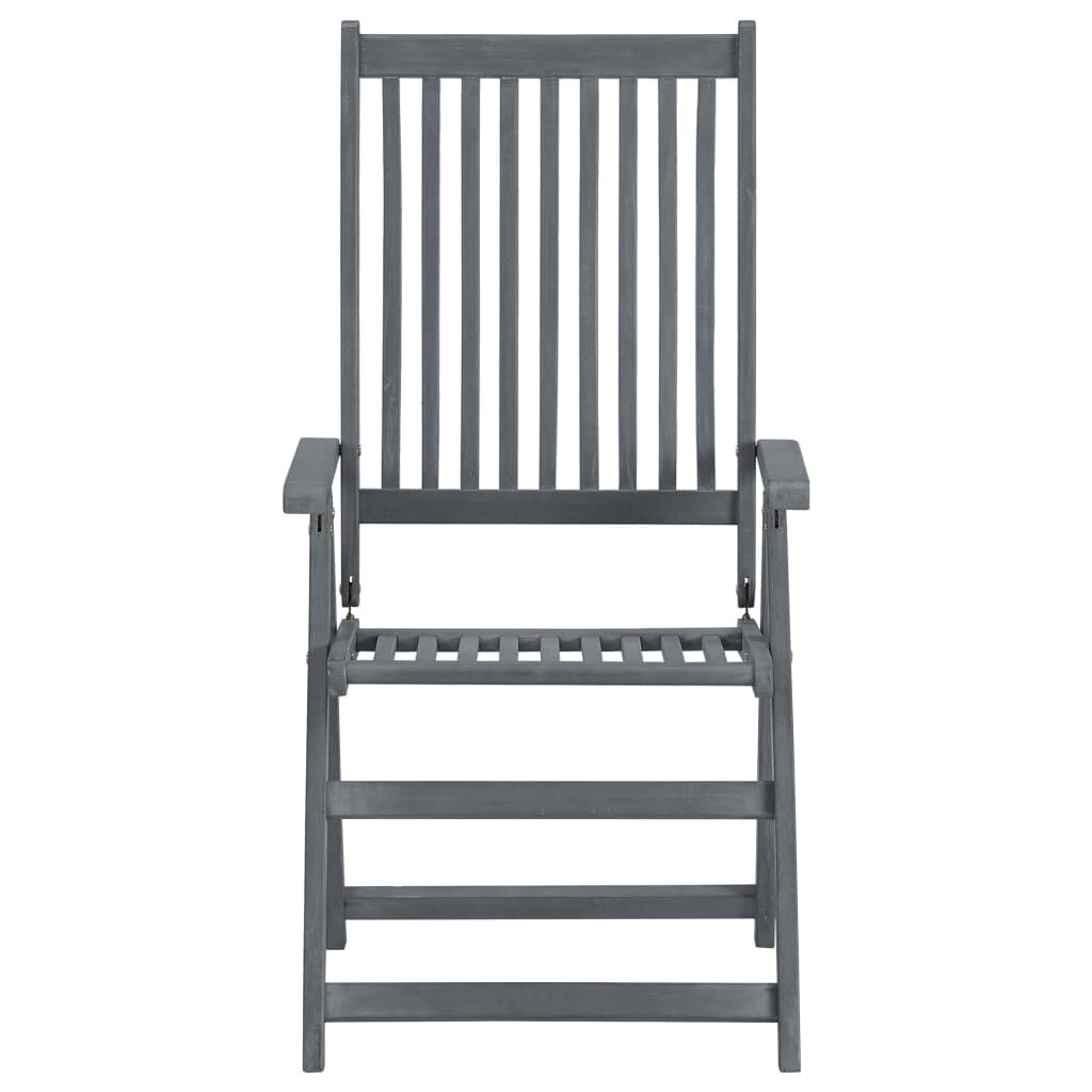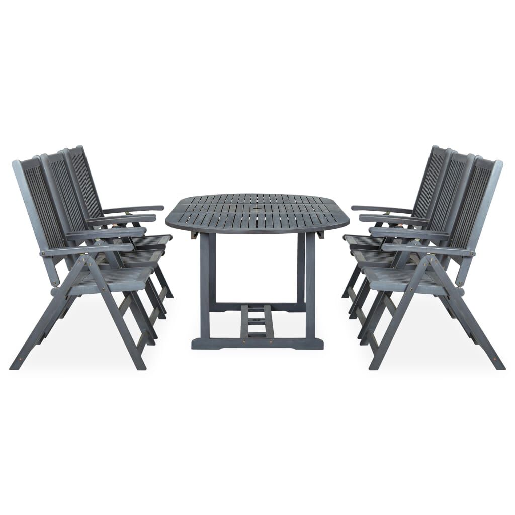 This stylish and contemporary dining set will add a luxurious touch to any dinner. Our wooden garden furniture set will be the focal point of your garden, terrace or patio. The dining set is made of solid acacia wood, a tropical hard wood, which is weather-resistant and durable for years of use. The oil finished surface is also easy to clean with a damp cloth. The chair can be adjusted to 5 positions which will provide you with optimal seating comfort. The table and the chairs can be folded to save space when not in use.