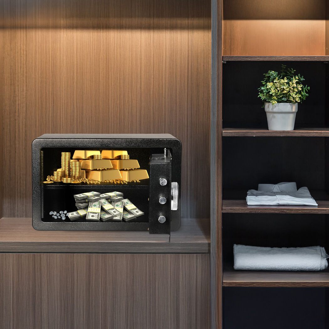 Protect your valuables with this secure digital safe – the perfect safe box for cash, documents, jewelry, and more! Whether you're looking for a small safe to store your money, a gun safe to keep firearms secure, or a fireproof safe to protect important documents from fire damage, this security box has you covered. It features an easy-to-use key safe system and a robust lock box design, making it an ideal choice for home, office, or travel. Keep your peace of mind knowing your most valuable items are locked up tight in this durable, fireproof document box. This money safe is a must-have for anyone who values security and protection – get yours today and experience the ultimate in safe storage!