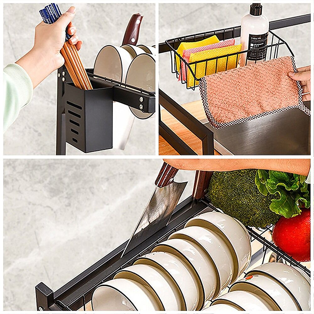 $69.55Organise your kitchen and save on space with Randy Travis Machinery's over-sink dish drying rack. A two-tier rack made from water-resistant coated steel, the rack tidily stashes crockery, cutlery, detergent and cleaning materials, as well as incorporates a compartment for fruit and veg storage.
