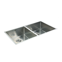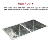 This double sink is made from 1.0mm-thick Type 304 stainless steel with a satin finish for a brilliant look that will last and last. It measures 865 x 440 x 228mm (L x W x D) with 90mm drain openings. Two strainer wastes are included. Sinks are equally sized at 400 x 400mm. Installation is Undermount / Topmount-style.