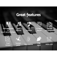 $275.41Love playing and singing to your favourite songs? Well, let our Alpha 88-key Portable Keyboard EK-881 help to realise your musical aspirations. With its 88 touch-sensitive keys, the portable keyboard enables you to discover a whole new world of music with exceptional built-in advanced features such as 140 timbres, 6 rhythms, 16 demo songs, various effect controls and many more. The split function allows you to split the keyboard into two sections to play two different voices or to play with another person on the same keyboard – perfect for lessons or duets. With the included sustain pedal, you can sustain longer notes, or you can choose to connect your own 3-in-1 pedal (not included) to simulate various piano-like sound effects and embellish your performance. There is also a MIDI output terminal at the back for you to connect a computer or another electronic musical instrument. Not least, with its headphones jack, the keyboard allows you to play silently without disrupting family or neighbours. An adjustable keyboard stand and music sheet holder come included as standard. With so much going for the Alpha 88-key Portable Keyboard EK-881, it will surely bring out the creative melody maker in you.