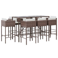 This trendy garden bar set, combining both style and function, is surely meant to be the centrepiece of your garden, patio, and any other living space. Weather-resistant material: PE rattan, also known as poly rattan, is weather resistant and easy to clean. It remains beautiful on the outside for a long period of time. It offers great quality, convenience and an aesthetic look.Comfortable seating: The bar stool is designed with footrest, backrest and armrests to offer you a comfortable seating experience. The soft seat and back cushions also add extra comfort.Tempered glass tabletop: The tabletop is made of tempered glass, making it easy to clean. Additionally, it offers excellent support for holding your drinks, snacks, and your favourite decorations.Sturdy and stable frame: The powder-coated steel frames make the pub set sturdy and stable for daily outdoor use.Wide applications: The bar table and stools, with its remarkable design, create a pleasant overall appearance that integrates effortlessly into any environment. Good to know:To make sure your outdoor furniture stays beautiful, we recommend protecting it with a waterproof cover.