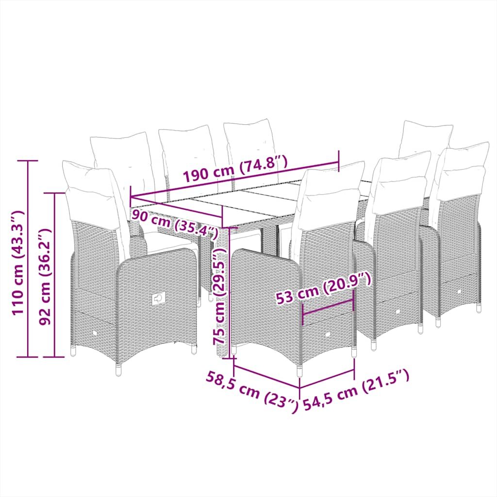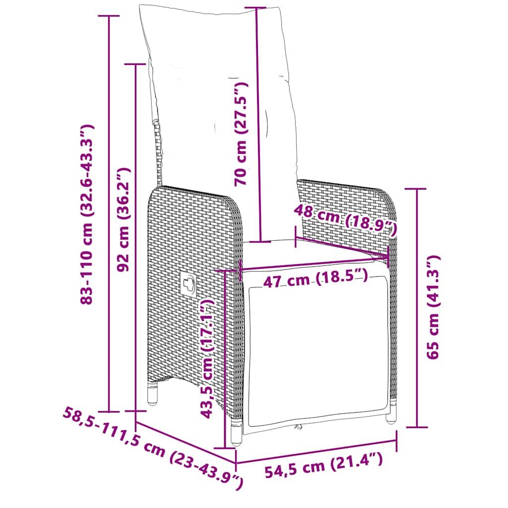 Enjoy a coffee or have a chat with your family and friends in the garden, backyard, or on the balcony with this comfortable bistro set! Durable material: PE rattan, also known as poly rattan, is a strong, low-maintenance synthetic material that looks like natural rattan. It's lightweight, easy to clean, and commonly used for outdoor furniture due to its durability and weather-resistant properties.Adjustable backrest and footrest: This garden seat has a handle. You can adjust the backrest and footrest to any position by pulling the handle, and quickly return it to its original position.Comfortable seat experience: This outdoor furniture, complete with thickly padded cushions, offers a comfortable seating experience.Removable and washable cover: These seat cushions feature removable covers for easy washing and maintenance. The back cushions have a flap at the back for easy attachment to the backrests.Glass tabletop: The outdoor table's top is made from strong and durable tempered glass, making it easy to clean with a damp cloth and adding a touch of elegance to your outdoor space. Good to know:To make sure your outdoor furniture stays beautiful, we recommend protecting it with a waterproof cover.