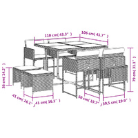 This garden dining set is a great choice for al fresco dining or just relaxing in the garden, backyard, or on the patio. Durable material: PE rattan, also known as poly rattan, is a strong, low-maintenance synthetic material that looks like natural rattan. It's lightweight, easy to clean, and commonly used for outdoor furniture due to its durability and weather-resistant properties.Compact storage: These chairs have a flap backrest that can be folded down, making it easy to store them under the table. When folded, they neatly fit under the table, forming a space-saving cube shape. Additionally, the stools can also be stored under the chairs, further maximising space efficiency.Comfortable seat experience: This outdoor furniture, complete with thickly padded cushions, offers a comfortable seating experience.Removable and washable cover: These seat cushions feature removable covers for easy washing and maintenance. The cushion covers have a flap at the back for easy attachment to the backrests.Glass tabletop: The outdoor table's top is made from strong and durable tempered glass, making it easy to clean with a damp cloth and adding a touch of elegance to your outdoor space. Good to know: To make sure your outdoor furniture stays beautiful, we recommend protecting it with a waterproof cover.