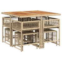 This garden dining set is a great choice for al fresco dining or just relaxing in the garden, backyard, or on the patio. Durable material: PE rattan, also known as poly rattan, is a strong, low-maintenance synthetic material that looks like natural rattan. It's lightweight, easy to clean, and commonly used for outdoor furniture due to its durability and weather-resistant properties.Compact storage: These chairs have a flap backrest that can be folded down, making it easy to store them under the table. When folded, they neatly fit under the table, forming a space-saving cube shape. Additionally, the stools can also be stored under the chairs, further maximizing space efficiency.Comfortable seat experience: This outdoor furniture, complete with thickly padded cushions, offers a comfortable seating experience.Removable and washable cover: These seat cushions feature removable covers for easy washing and maintenance. The cushion covers have a flap at the back for easy attachment to the backrests.Stable and easy-to-clean tabletop: This garden table has an acacia wood top that is sturdy, durable, and easy to clean with a damp cloth. Good to know:To make sure your outdoor furniture stays beautiful, we recommend protecting it with a waterproof cover.
