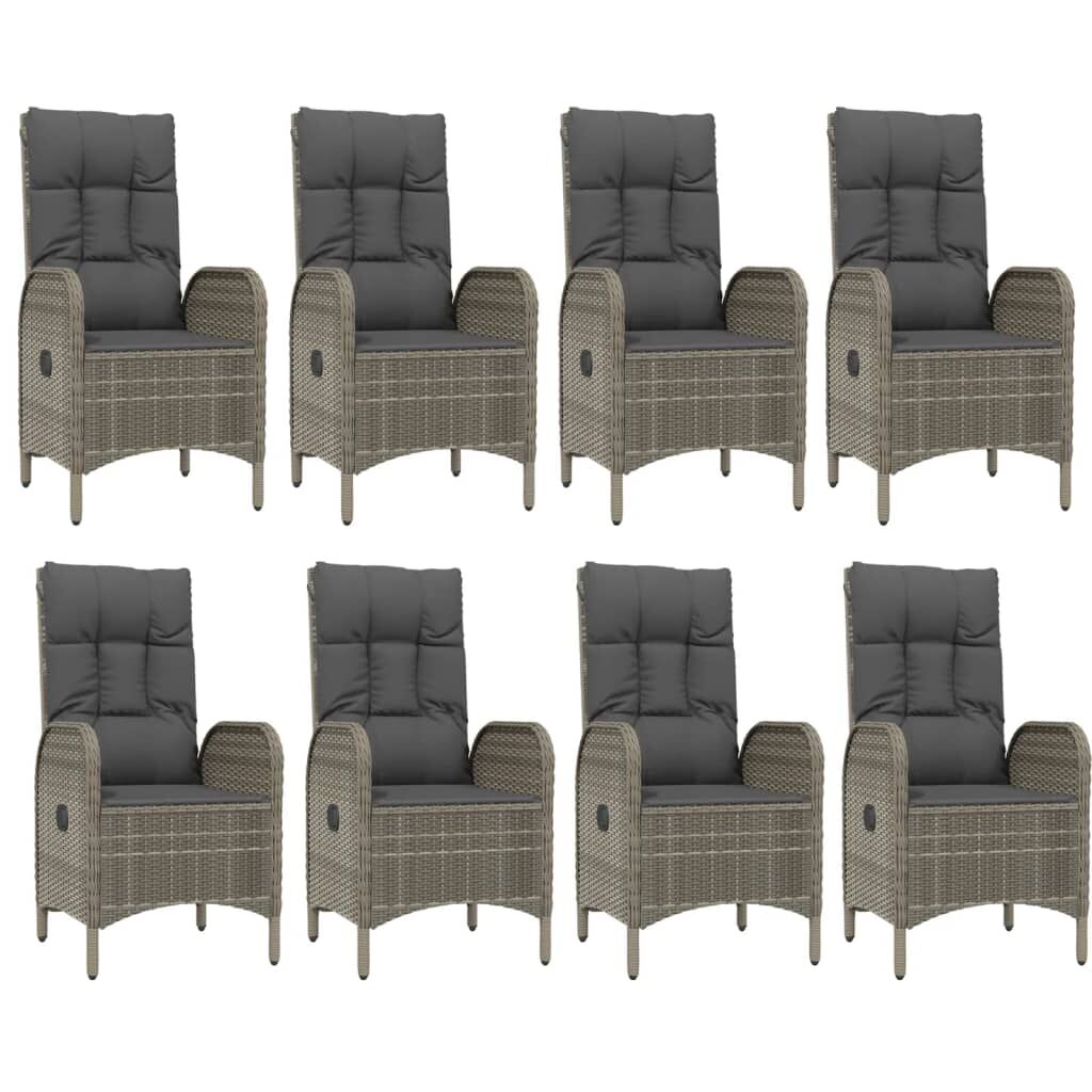 This trendy garden dining set, featuring an elegant and contemporary design, is a great choice for dining or relaxing in your garden. Weather-resistant material: PE rattan, also known as poly rattan, is weather resistant and easy to clean. It remains beautiful on the outside for a long period of time. It offers great quality, convenience and an aesthetic look.Sturdy frame: The powder-coated steel frames make the outdoor dining set sturdy and stable for daily outdoor use.Practical tabletop: The smooth tabletop of the garden table is made of tempered glass which is easy to clean with a damp cloth. Additionally, the sturdy tabletop is perfect for placing meals, drinks, and other decorative items.Reclining function: The garden chairs are specially designed with a reclining function so that you can adjust the backrest as per your comfort.Comfortable seat experience: The backrest adds extra seating comfort for the garden chair. Also, the thickly padded cushions provide comfort for your sitting time. Good to know:To make assembly as easy as possible, each product is delivered with a manual. Note:To make sure your outdoor furniture stays beautiful, we recommend protecting it with a waterproof cover.