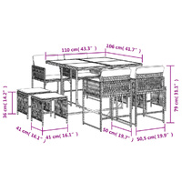 This garden dining set is a great choice for al fresco dining or just relaxing in the garden, backyard, or on the patio. Durable material: PE rattan, also known as poly rattan, is a strong, low-maintenance synthetic material that looks like natural rattan. It's lightweight, easy to clean, and commonly used for outdoor furniture due to its durability and weather-resistant properties.Compact storage: These chairs have a flap backrest that can be folded down, making it easy to store them under the table. When folded, they neatly fit under the table, forming a space-saving cube shape. Additionally, the stools can also be stored under the chairs, further maximizing space efficiency.Comfortable seat experience: This outdoor furniture, complete with thickly padded cushions, offers a comfortable seating experience.Removable and washable cover: These seat cushions feature removable covers for easy washing and maintenance. The cushion covers have a flap at the back for easy attachment to the backrests.Stable and easy-to-clean tabletop: This garden table has an acacia wood top that is sturdy, durable, and easy to clean with a damp cloth. Good to know:To make sure your outdoor furniture stays beautiful, we recommend protecting it with a waterproof cover.