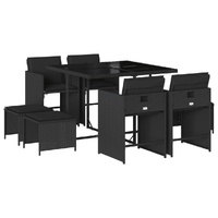 This garden dining set is a great choice for al fresco dining or just relaxing in the garden, backyard, or on the patio. Durable material: PE rattan, also known as poly rattan, is a strong, low-maintenance synthetic material that looks like natural rattan. It's lightweight, easy to clean, and commonly used for outdoor furniture due to its durability and weather-resistant properties.Compact storage: These chairs have a flap backrest that can be folded down, making it easy to store them under the table. When folded, they neatly fit under the table, forming a space-saving cube shape. Additionally, the stools can also be stored under the chairs, further maximizing space efficiency.Comfortable seat experience: This outdoor furniture, complete with thickly padded cushions, offers a comfortable seating experience.Removable and washable cover: These seat cushions feature removable covers for easy washing and maintenance. The chair cushion covers have a flap at the back for easy attachment to the chairs.Stable and easy-to-clean tabletop: This garden table has a tempered glass table top that is sturdy, durable, and easy to clean with a damp cloth. Good to know: To make sure your outdoor furniture stays beautiful, we recommend protecting it with a waterproof cover.