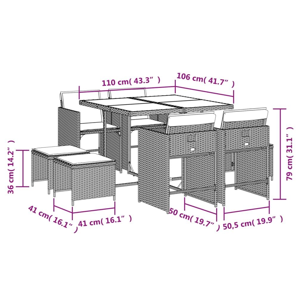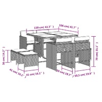 This garden dining set is a great choice for al fresco dining or just relaxing in the garden, backyard, or on the patio. Durable material: PE rattan, also known as poly rattan, is a strong, low-maintenance synthetic material that looks like natural rattan. It's lightweight, easy to clean, and commonly used for outdoor furniture due to its durability and weather-resistant properties.Compact storage: These chairs have a flap backrest that can be folded down, making it easy to store them under the table. When folded, they neatly fit under the table, forming a space-saving cube shape. Additionally, the stools can also be stored under the chairs, further maximizing space efficiency.Comfortable seat experience: This outdoor furniture, complete with thickly padded cushions, offers a comfortable seating experience.Removable and washable cover: These seat cushions feature removable covers for easy washing and maintenance. The chair cushion covers have a flap at the back for easy attachment to the chairs.Stable and easy-to-clean tabletop: This garden table has an acacia wood top that is sturdy, durable, and easy to clean with a damp cloth. Good to know: To make sure your outdoor furniture stays beautiful, we recommend protecting it with a waterproof cover.