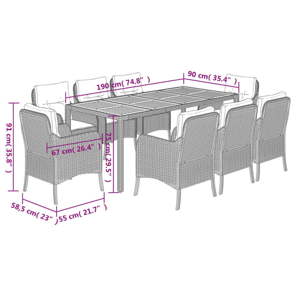 This garden dining set is a great choice for al fresco dining or just relaxing in the garden, backyard, or patio. Durable material: PE rattan, also known as poly rattan, is a strong, low-maintenance synthetic material that looks like natural rattan. It's lightweight, easy to clean, and commonly used for outdoor furniture due to its durability and weather-resistant properties.Comfortable seat experience: This outdoor furniture, complete with thickly padded cushions, offers a comfortable seating experience.Removable and washable cover: These seat cushions feature removable covers for easy washing and maintenance. The chair cushion covers have a flap at the back for easy attachment to the chairs.Stable and easy-to-clean tabletop: This garden table has an acacia wood top that is sturdy, durable, and easy to clean with a damp cloth.Robust and stable frame: The powder-coated steel frame ensures the garden furniture is strong and stable for daily outdoor use. Good to know:To make sure your outdoor furniture stays beautiful, we recommend protecting it with a waterproof cover.